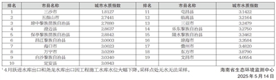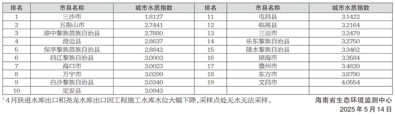 19个市县水环境质量按由好至差排名分别为:三沙市、五指山市、琼中黎族苗族自治县、澄迈县、保亭黎族苗族自治县、昌江黎族自治县、海口市、万宁市、白沙黎族自治县、定安县、屯昌县、临高县、三亚市、乐东黎族自治县、陵水黎族自治县、琼海市、儋州市、东方市和文昌市。详见右表: