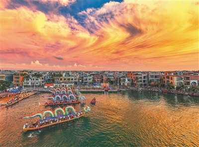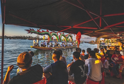 在海口海甸溪上,一艘艘龙舟如离弦之箭,在桨手们整齐有力的划动下前行。岸边市民游客振臂高呼,加油声响彻两岸。临高新盈港端午龙舟赛上,来自各村的数十艘龙舟、龙船亮相,吸引了周边数万民众到场观战助威。该赛事最大特色在于,龙舟上部由村民按古法手工制作的龙头、龙身、龙尾组合而成,下部是专门定制的宽大龙船(舵手可达40多位)。