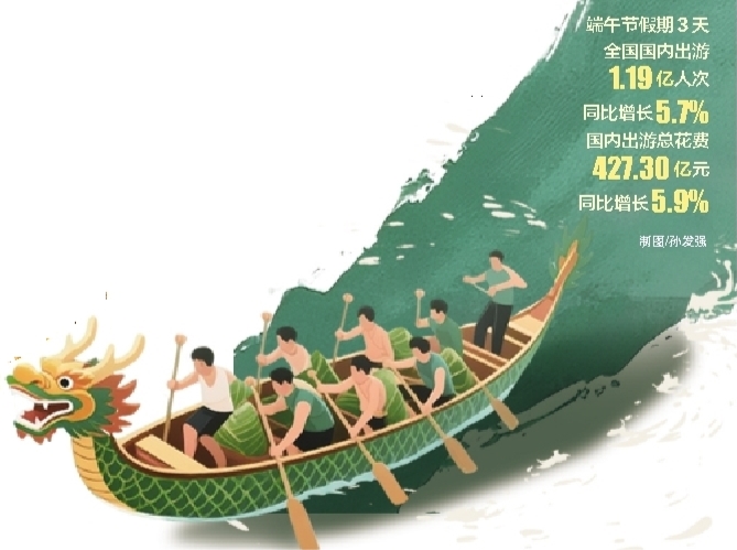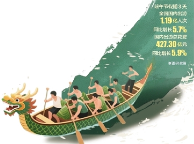 文化和旅游部最新数据显示,端午节假期3天,全国国内出游1.19亿人次,同比增长5.7%;国内出游总花费427.30亿元,同比增长5.9%。
