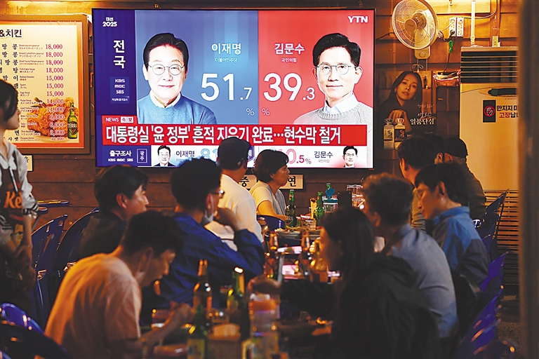出口民调显示,呼声较高的三名热门候选人中,李在明以51.7%的得票率位居首位,国民力量党候选人金文洙以39.3%的得票率位居第二,改革新党候选人李俊锡获得7.7%的选票。