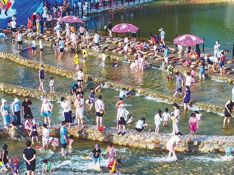 市民游客乘龙船摇曳南圣河上,观民族歌舞、赏两岸光影交织,山风拂面;下游地带的小岛公园水幕秀在夜色中璀璨亮相,灯光和水幕交织成一幅幅流动的画卷;鱼鳞坝成了炎夏遛娃好去处,在浇灭暑气的同时,亲子家庭还在此享受鱼鳞坝浮动下午茶。