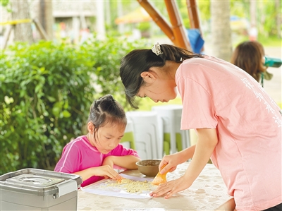 堆土搭窑,全家上阵烤起叫花鸡;描图染布,齐心协作制作一块“型糊染”手工;铺平粽叶,大手拉小手做一个家庭专属粽子……