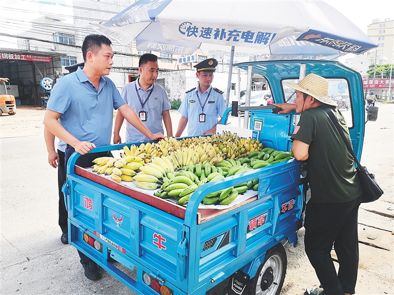 5月22日至23日,海口市综合行政执法局秀英分局城市管理行政执法大队联合长流镇综合行政执法中队,在琼华村农贸市场周边开展集中整治行动。面对一些三轮车占道经营者、肩挑贩卖蔬菜的摊贩,执法人员深入讲解城市管理政策法规,耐心劝导其到指定区域规范经营,并主动帮助摊贩搬运货物至市场摊位,赢得了摊贩的理解与群众的广泛认可。