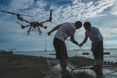 岸边,陈宏与助手正将活体珊瑚苗固定在特制的苗圃架上。随后,他们用无人机慢慢吊起珊瑚苗圃架,精准“空投”至目标海域。