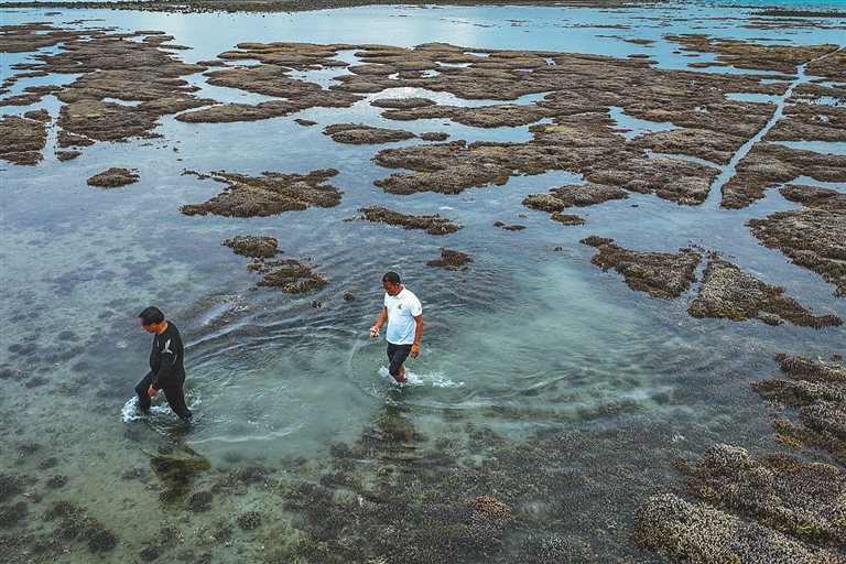 5月30日,傍晚的三亚湾正在退潮。在海南南海热带海洋研究所一处珊瑚修复试验基地海域,形态各异的珊瑚礁在清澈的海水中若隐若现,长势喜人。这是海南南海热带海洋研究所所长陈宏及其团队深耕多年的“海底雨林”一角。