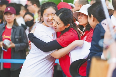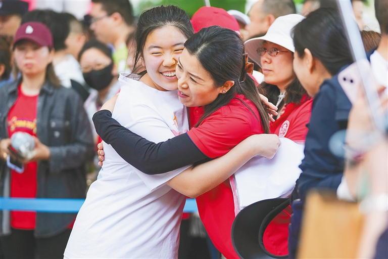 7时30分,北京一零一中学考点外,一位家长挥手目送孩子步入考场,不忘拿起手机拍下孩子的背影。安检通道前,送考教师早已列队等候,与考生击掌拥抱,加油打气。