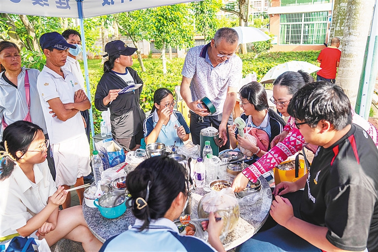 ② 6月8日,在海口市琼山中学考点外,高考考生在英语考试结束后走出考场,品尝家人带来的爱心便当。