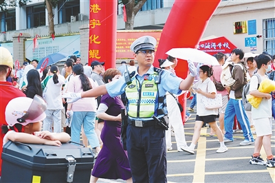 ① 6月8日,海口海港学校考点外,考试结束后,一名交警正在维持交通秩序。