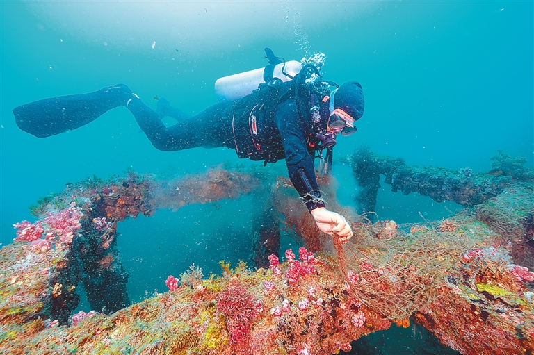 在海底种珊瑚,得下绣花功夫。水面下,王丰国咬着呼吸管,手指在礁石、珊瑚间活动,胶水如丝线,钉子似银针,将破碎的珊瑚“缝补”成片片生机。浪头拍来,咸涩的海水灌进面镜,他被呛得咳嗽,仍死死护住怀里的珊瑚苗。“绣花讲究慢、细、稳,种珊瑚也是,‘一针一线’都是对生命的敬畏。”王丰国说。