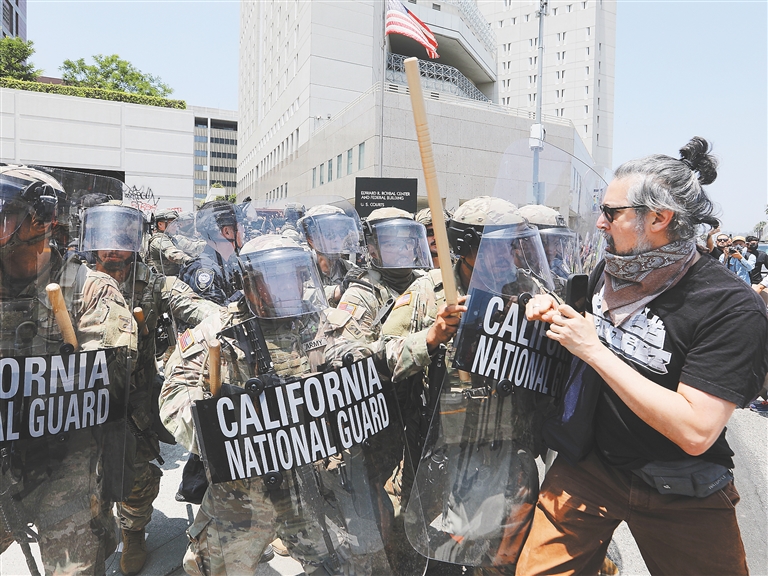 据报道,这是60年来美国总统首次在未获州长请求情况下直接调动该州国民警卫队应对国内骚乱。加州及洛杉矶地方政府强烈反对联邦政府这一举措,加州政府与联邦政府、共和党与民主党的移民政策冲突更加激化。一名现场民众在和记者交谈时问道:“这是你印象里的洛杉矶吗?现在美国出了什么问题,总是一半人在反对另外一半人。”