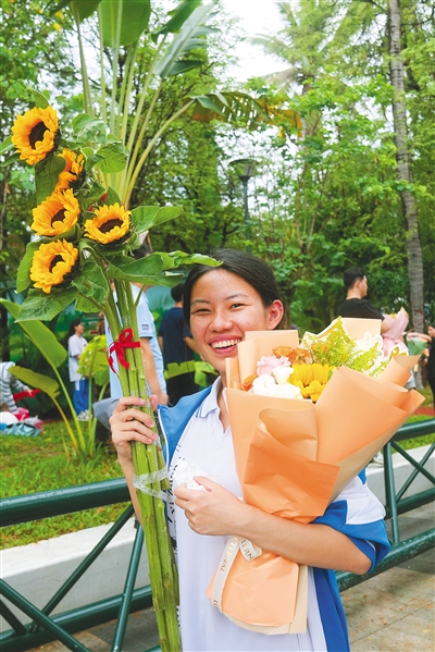 ④6月10日,三亚市第一中学考点门口,考生手拿向日葵开心走出考场。