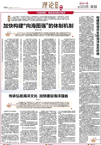 2024年12月17日,习近平总书记在听取海南省委和省政府工作汇报时强调,“坚持陆海统筹、山海联动、资源融通,抓好海洋开发,向海洋要生产力、求新增长点,建设海洋强省。”海南因海而生,向海而兴,是全国受权管辖海域面积最大的省份,在建设海洋强省过程中,理应有更大担当、更大作为。加快构建“向海图强”的体制机制,对实现“再造一个‘海上海南’”战略目标、加快推进海洋强省建设具有重要意义。