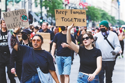 9日,抗议者在华盛顿集会,游行队伍经过司法部大楼,抗议美国移民与海关执法局突击搜捕移民的行动。