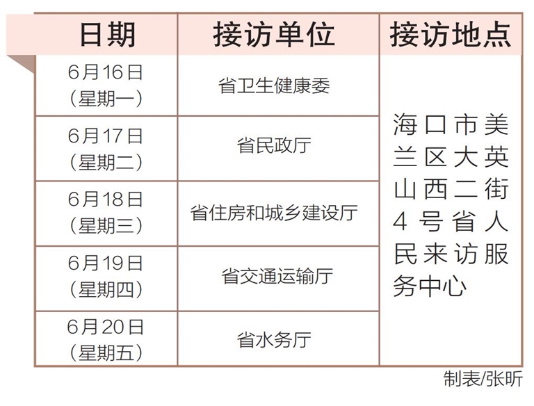 6月16日至20日,省卫生健康委、省民政厅、省住房和城乡建设厅、省交通运输厅、省水务厅相关负责人将在海口市美兰区大英山西二街4号省人民来访服务中心接访群众。