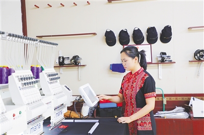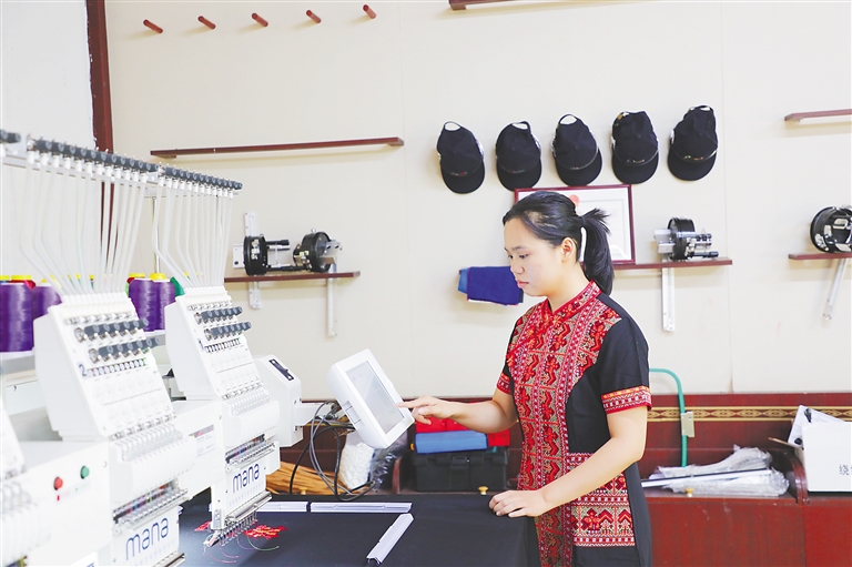 曾几何时,当地绣娘接单制作一件黎锦服饰,需要经过绘图、裁布、绣制、藏头等工序,仅手工绘图一项便需耗费数日,制作周期长达半年;如今,借助自动绣花机,以及电子平车机、锁边机等小型机器,仅需20天就可以做好300套到400套成衣。