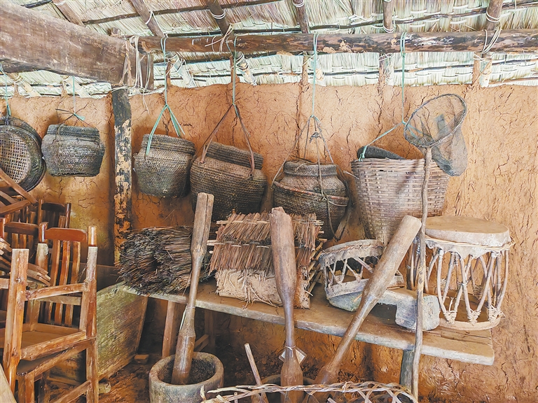 在文旅融合方面,洪水村已“先行一步”。2021年,“黎奢·时光里”民宿项目落地,有关方面在破损的茅草屋旧址上改建出十余间特色客房。步入客房,黎锦纹样的刺绣枕被与原木家具相映成趣,复古灯具投下暖黄光晕;房外的庭院中,竹编鱼篓、犁田钉耙等传统农具有序陈列。从建筑外形到陈设细节,民宿将黎族生产工具、生活美学融入空间设计,让游客在沉浸式体验中触摸黎族文化肌理。