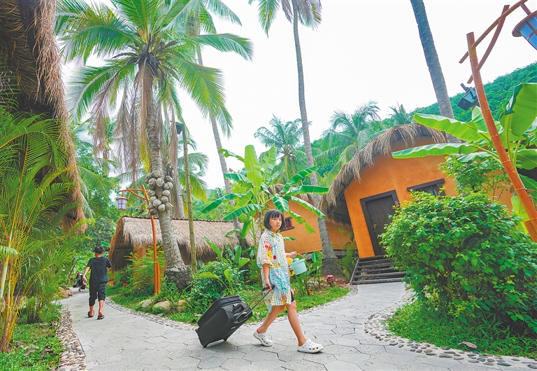夜晚的“黎奢·时光里”更具韵味。每当夜幕降临,民宿利用声光电技术将茅草屋外墙变成“幕布”,通过实物陈列、动态展示等多种手法,再现早年黎族村落生活场景,让游客“穿越式”体验。民宿运营总监南华峰介绍,他们还会安排管家带着客人体验下田插秧、溪中摸螺等农事,或跟着黎族百姓学织锦、跳竹竿舞。为了优化游览线路,南华峰经常利用空闲时间去周边山林溪谷中徒步,“只有自己走过山间的每一条小道,才能给游客推荐更地道的玩法”。