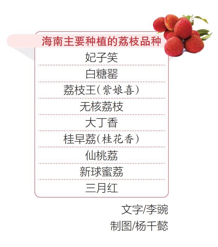 不过,近年来,由于市场竞争加大等原因,妃子笑这样的经典品种也在更新换代。“前些年,妃子笑在海南全省荔枝种植面积中占比约90%,这几年降至80%左右,荔枝新品种不断增多。”张蕾介绍,近年来,桂早荔、荔枝王、无核荔枝等新品种正在海南逐渐扩大种植规模。