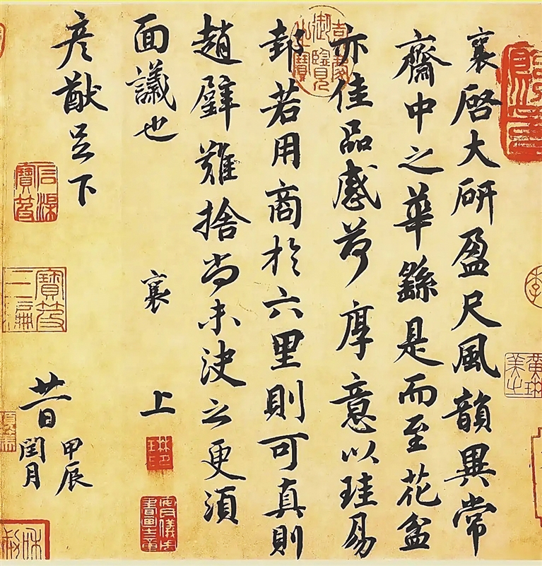 北宋治平元年(1064年)的一天,蔡襄得到了一块好墨,立即告诉了老朋友唐询(字彦猷)。唐询不仅对砚台颇有研究,在墨方面也是资深专家。他翻了一下自己的家底,然后写信给蔡襄介绍,自己收藏了一方稀世大砚、一块李庭珪墨和一个精美花盆,说:“咱俩交换一下吧!”蔡襄收到信后哈哈大笑,挥笔给老朋友回了一封信,这就是《大研帖》。《大研帖》围绕“以砚易物”展开,信的内容很有意思,信的文字书写更是精彩,堪称“宝藏信札”。蔡襄在信中称:唐询的大砚非普通文具,“大研盈尺,风韵异常,斋中之华,繇是而至”,并以“商於六里”和“赵璧难舍”的典故委婉表达了自己不舍得换的意思,说接下来再商量,言语间带着文人的诙谐和风趣。从信中可见蔡襄对文房雅物的珍视,以及宋代文人将收藏与生活相融的一面。
