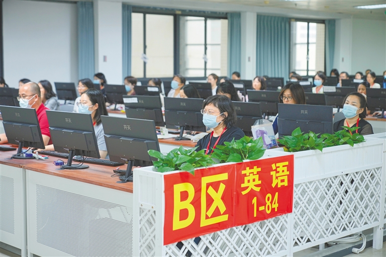 进入评卷场,记者看到,入口处有安保人员值守,所有人员入场须凭有效证件,并通过智能安检门、人工安检两道关口,禁止携带手机等通信设备。评卷场内,评卷教师们坐在电脑前专注地评阅,键盘声此起彼伏;张贴在醒目位置的“科学公正、量分合理”“宽严适度、前后一致”等标语映入眼帘,现场秩序井然。