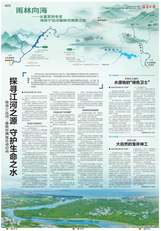 据介绍,宁远河的源头位于保亭毛感乡毛感村,最终流向三亚市崖州区;藤桥河起于毛感乡毛瑞林场,终于三亚市海棠区。宁远河和藤桥河串联起了三亚、保亭的生态脉络,孕育了两地丰富的自然与人文资源。溯源宁远河与藤桥河,不仅是探寻河流的地理源头,更是追溯人与自然和谐共生的初心,凝聚全社会守护碧水清流的坚定决心,呼吁公众共同谱写“水清岸绿、景美人和”的生态新篇章。