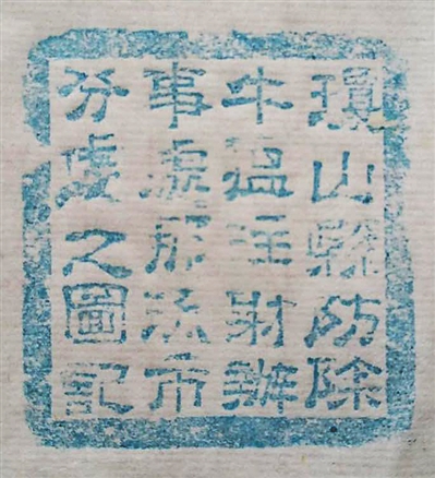 细细清理之后,蘸印泥打章,只见印面为20个隶体字刻:“琼山县防除牛瘟注射办事处那流市分处之图记。”结体扁方,布列均衡,点画灵动,爽快内敛,非一般书家、刻家所能为。
