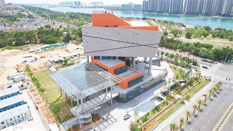 海南日报全媒体记者看到,这座造型独特的建筑里,主体楼栋和附楼交错建设,在一楼的架空层形成了宽阔的玩耍空间。因有建筑物的遮挡,阳光无法直射,形成了一处清凉空间。架空层还安装了可供上下的手扶电梯,为行人上下电梯提供了清凉“保护”。