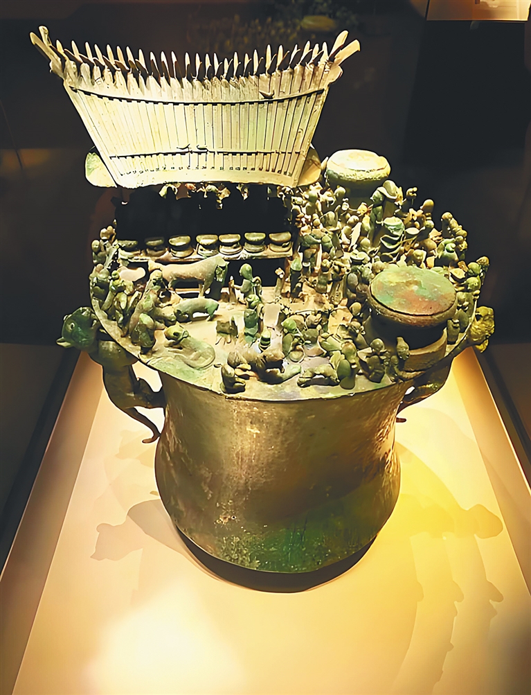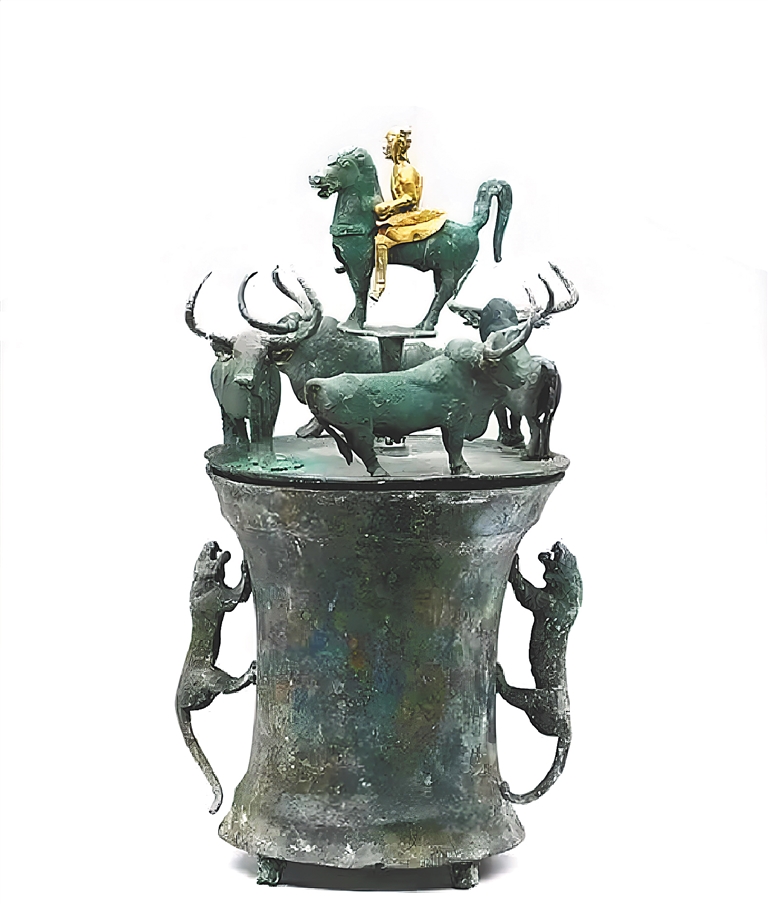 古滇国文明似乎对贮贝器情有独钟,“鎏金四牛骑士”可不是唯一的造型,仅就牛的数量来说,一牛到八牛都有,而人物形象也不一而足,有骑士、有妇女、有奴隶,体现了当时古滇国文明的方方面面。