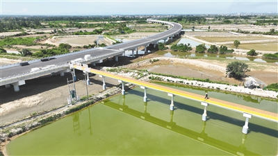 6月23日,俯瞰位于儋州的海南环岛旅游公路环新英湾支线北门江特大桥工程。目前该桥主体结构已完成全部施工,正进行栏杆安装等收尾工作。