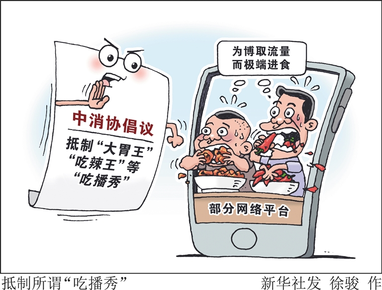 新华社北京6月24日电 (记者赵文君)针对以暴饮暴食、猎奇比拼为特征的所谓“吃播秀”,中国消费者协会6月24日发出倡议,指出为博取流量而极端进食的行为是赤裸裸的食物浪费,呼吁广大消费者不追捧、不点赞、不转发极端吃播内容,主动屏蔽相关账号和频道。