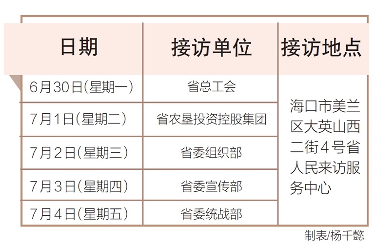 6月30日至7月4日,省总工会、省农垦投资控股集团、省委组织部、省委宣传部、省委统战部相关负责人将在海口市美兰区大英山西二街4号省人民来访服务中心接访群众。