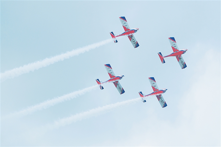近日,万宁智慧航空产业园一期竣工交付。据悉,该产业园将重点发展加工制造、飞机组装、零部件业务等,同时结合文旅打造特色体验场景。图为6月28日园区启航首秀中,飞行编队在空中进行表演。