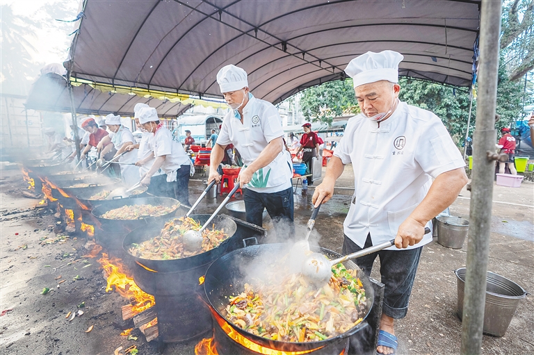 6月28日傍晚,海南“村VA”重兴村宴现场,“村厨”正在烹制文昌村宴头盘菜——知名特色菜品“全家福”。
