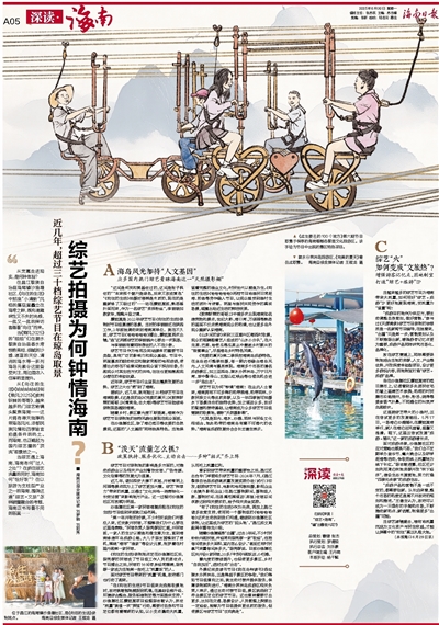 综艺节目为何“钟情”海南?在业内人士看来,海南拥有不可多得的热带滨海、热带雨林、少数民族文化等优质资源,以及一年四季皆可拍摄水下场景戏份的独特优势,加之酒店众多,良好的配套和接待基础,让海南成为众多综艺节目组青睐的取景地,堪称“天然摄影棚”。