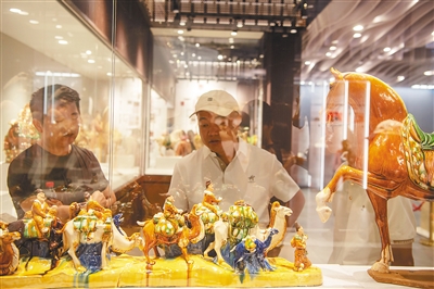 踏入传习馆第一个功能厅——文博展陈厅,映入眼帘的是形态各异栩栩如生的唐三彩马、骆驼、人物和器皿。据介绍,这些展陈艺术作品,均是由国家级非物质文化遗产代表性传承人、中华老字号“高家三彩”掌门人高水旺大师唐三彩文物1:1复刻艺术展作品中的代表作。