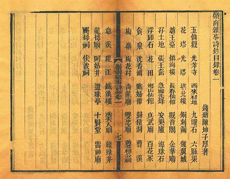 岭南地处中国南疆边陲,北枕南岭,南临南海,这里的物产、习俗与中原地区有很多差异,陈坤对这些很感兴趣,进而收录研究,终撰成书籍。此古籍刊刻于光绪三年(1877年),也就是陈坤离开琼山数年后,他完成了《岭南杂事诗钞》,随后开始刊刻。