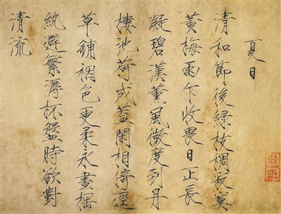 北宋政和年间,宋徽宗赵佶在一个夏日里,极有兴致地用“瘦金体”写了一首诗,即《夏日诗帖》。诗的内容为“清和节后绿枝稠,寂寞黄梅雨乍收。畏日正长凝碧汉,薰风微度到丹楼。池荷成盖闲相倚,迳草铺裀色更柔。永昼摇纨避繁溽,杯盘时欲对清流”。诗中“黄梅雨”“池荷”“薰风”等意象,勾勒出一幅幽静雅致的夏景图。雨停之后,眼前的绿植更显青翠,微风吹来,空气中涌动着香气,如盖的荷叶铺满了水池,还有人轻轻摇动纨扇,可谓处处透着舒适与清凉。