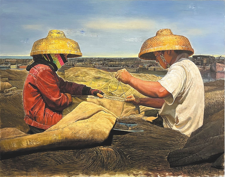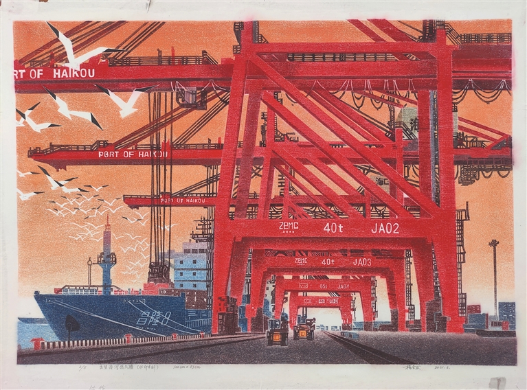 范迪安的油画《云月湖畔》用色大胆,用丰富的颜色层次让海南的绿水青山跃然纸上,也隐喻着海南自贸港发展的蓬勃力量;邢述评的漆画《丰年蜜酒》用夸张的手法,传神地刻画了黎族百姓丰收后的喜悦之情;杨全发的水印木刻作品《自贸港湾热气腾》,通过繁忙的洋浦港,侧面彰显了海南自贸港的红红火火;王锐的油画《有光的庭院》,则以浓郁的色彩,活灵活现地表现了黎族人民的美好生活。