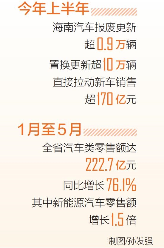 据统计,今年上半年,海南汽车报废更新超0.9万辆,置换更新超10万辆,直接拉动新车销售超170亿元。1月至5月,全省汽车类零售额达222.7亿元,同比增长76.1%,其中新能源汽车零售额增长1.5倍。