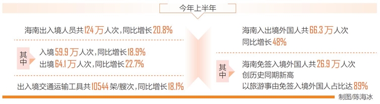 据海口出入境边防检查总站统计,截至6月30日,今年上半年,海南出入境人员共124万人次,同比增长20.8%,其中,入境59.9万人次,同比增长18.9%,出境64.1万人次,同比增长22.7%;出入境交通运输工具共10544架/艘次,同比增长18.1%,出入境人员及交通运输工具较去年同期均明显增长。上半年,海南入出境外国人共66.3万人次,同比增长48%。