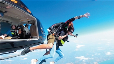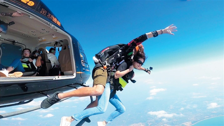 “95后”游客王紫说,纵身跃出机舱的那一刻,4000米高空的风声与自己的心跳声交织在一起,三亚湾蔚蓝壮阔的大海尽收眼底。她用跳伞这一特殊运动,迎接自己的30岁生日。