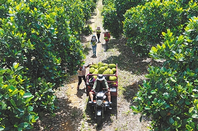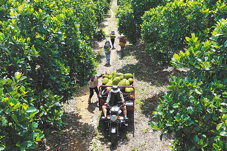 近日,位于儋州市光村镇的海南农垦西联农场公司菠萝蜜标准化种植基地里,农户运送成熟的菠萝蜜。海报集团全媒体中心记者 蒙美顺 摄