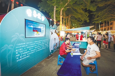 7月4日晚,文昌市重兴镇三角庭农场排球场外的劳务夜市,一位看球观众在比赛间隙咨询求职问题。