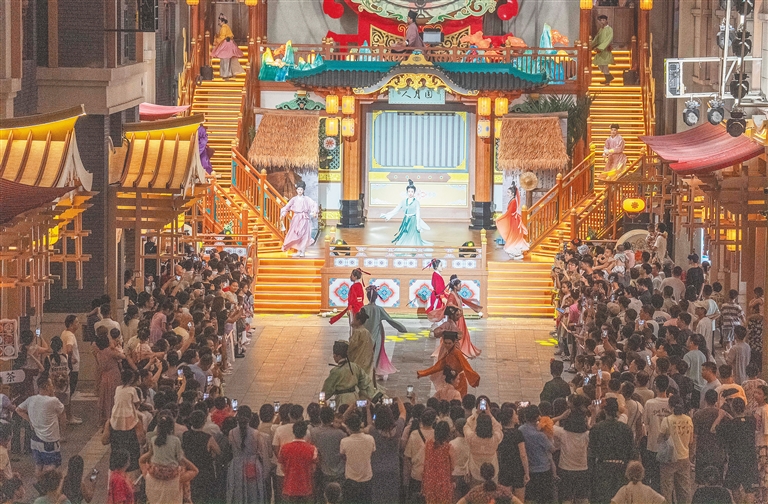 7月5日,海口东坡老码头热闹非凡,不少市民游客在观看演出。海口东坡老码头是国内首个沉浸式东坡文化生活街区,为市民游客营造一站式“东坡生活美学+海南风物”创新型沉浸体验。海南日报全媒体记者 李天平 摄