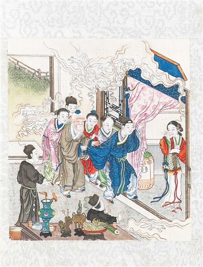 《聊斋全图》(简称“全图”本)于清末问世。原为90册,多散佚。其中,前48册每文一图,之后则每文配二至七图不等。与“图咏”本在“扼要处着笔”绘制单图的风格不同,“全图”本图画占据主导地位,文字从属于图像,视觉冲击力更强。以《聂小倩》为例,“图咏”本单幅主题画抓住宁采臣拒绝诱惑、掷金而去这个情节,构图偏室外,突出庭院、树木、月夜,人物比例较小,气氛清冷文雅;“全图”本则展现聂小倩婚后生活场景,如婚后点灯读书、画兰展才、革囊放鬼捉夜叉等,细致描绘了床帐、墙画、条桌、绣墩等家居陈设,呈现世俗生活之美,休闲性、趣味性更为鲜明。