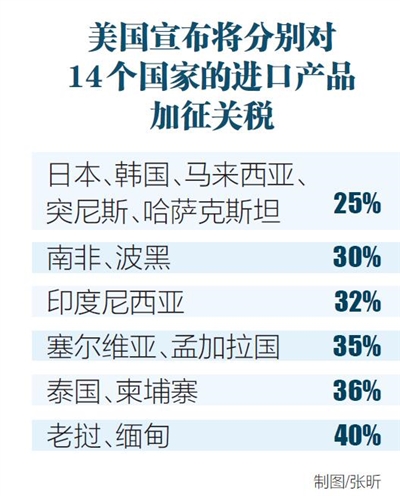 特朗普当天在社交媒体上陆续发布他写给日本、韩国等14国领导人的信函,称将从8月1日起对这些国家征收25%到40%不等的关税。