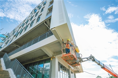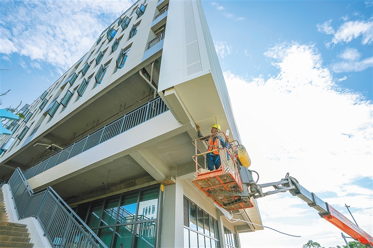 日前,海南控股旗下海控建设承建的海口江东新区航空科技研发基地项目现场,工人进行外立面收尾工作。据悉,该项目将搭建标准、技术、信息与硬件资源共享平台,投用后将提升海南航空科技研发创新驱动力,目前总体进度已完成98%。