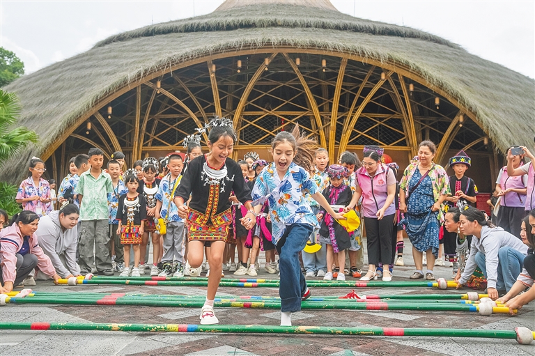 7月9日,36名新疆克拉玛依的孩子走进海南五指山市水满乡,与五指山黎苗童声合唱团的小伙伴们开展联谊活动。图为在五指山市水满乡毛纳村,身穿“岛服”的新疆克拉玛依孩子(前排右一)与黎族孩子跳起竹竿舞。