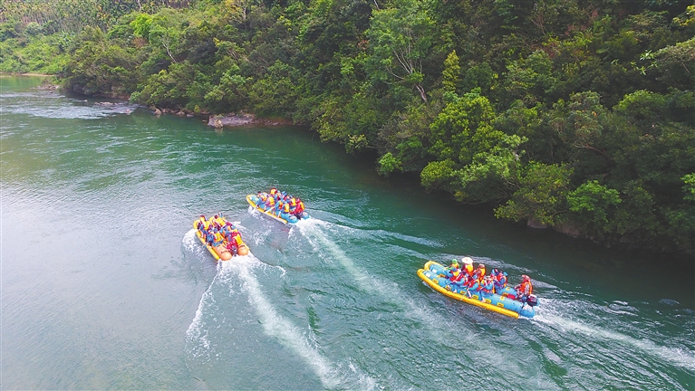 博物馆化身“知识空调房”,万泉河峡谷则泼洒出大自然的“清凉盛宴”。游客张建军一家刚从橡皮艇上下来,他10岁的儿子头发还在滴水,手里攥着刚捞的树叶标本。“船在山中行,人游溪谷间,这句宣传语太贴切了。”张建军说。