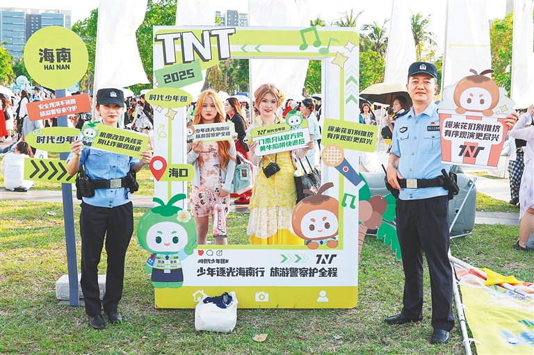 海口“五一”假期演艺活动精彩纷呈,海口警方多警种协同护航。5月3日至4日,时代少年团“加冠礼”演唱会在五源河体育场举行,全国7万名歌迷赴约。各警种协同配合、紧密衔接,做好巡逻防控、交通疏导、案件查办、矛盾纠纷调处、现场秩序维护、接受群众问询和求助等各项工作,热心服务现场群众。现场设置的“少年逐光海南行,旅游警察护全程”打卡点吸引粉丝参与。